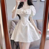 فستان أنيق على الطراز الفرنسي بأكمام منفوخة للنساء ، فستان قصير صيفي راقي ، تركيب الخصر ، تنورة تشبه الجنية ، أبيض