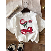 تي شيرت نسائي أبيض بأكمام قصيرة مدورة ، قميص قطني مريح ، تيشيرت غير رسمي ، مطبوع عليه الكرز ، مناسب للصيف ، جديد ،