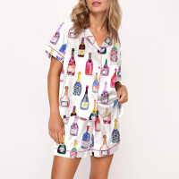 طقم بيجامات نسائي مكون من قطعتين ، أكمام قصيرة ، طباعة شامبانيا ، قميص وشورت بأزرار لأعلى ، ملابس منزلية فضفاضة ، الصيف