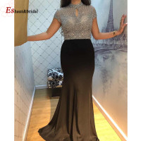 فستان سهرة نسائي كريستالي ، رقبة عالية ، أكمام قصيرة ، ساتان مرن ، طويل ، حفلة موسيقية رسمية ، فساتين حفلات زفاف ، فاخرة ،
