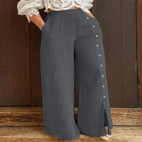بنطال بساق واسعة بخصر مرن للنساء ، بنطلون طويل بجيب ، ديكور بأزرار ، أحادي اللون وفضفاض ، أنيق وعصري ، كاجوال وأنيق