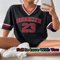 تي شيرت برقبة على شكل V كبير الحجم ، للرجال والنساء ، قمم بأكمام قصيرة ، ملابس الشارع النسائية ، تي شيرت كبير الحجم ، اتجاه هاراجاكو ، بروكلين رقم 23 ، الصيف