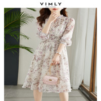 فساتين شيفون أنيقة للسيدات من Vimly ، خط عتيق ، ياقة قائمة ، أكمام طويلة ، فستان بنقشة زهور ، V7983 ،