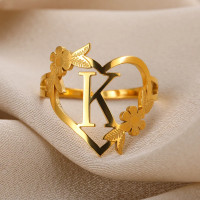 الفولاذ المقاوم للصدأ الأحرف الأولى زهرة القلب خواتم الذهب اللون قابل للتعديل حساسة رسالة ليف خواتم للنساء فتاة الأبجدية مجوهرات