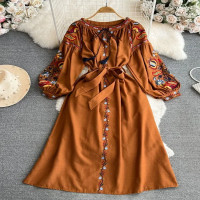 للمرأة فستان قطن كتان قديم, نمط عرقي, فانوس كم طويل, مطرز رقبة مستديرة, نحيل, a-line, ربيع, خريف, D4930