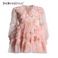 فستان نسائي مرقع Twotwinstyle ، فستان مرقع مع طباعة مكعبات ملونة ، رقبة على شكل حرف v ، أكمام طويلة ، خصر مرتفع ، أنيق