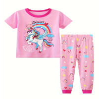 مجموعات بيجامة من قطعتين للفتيات ، بنطلون متناسق ، مجموعات PJ غير رسمية ، توب برقبة مستديرة ، نمط وحيد القرن برسوم كرتونية ، أكمام قصيرة ، طباعة كاملة ، عصرية