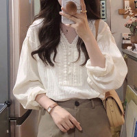 بلوزة نسائية قطنية بأكمام طويلة وفانوس، بلايز بيضاء، سيدة مكتب، أنيقة، ربيع، صيف، رقبة على شكل حرف V، موضة 8225