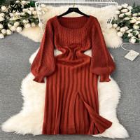 فستان كنزة سنريري فرنسي محبوك لكبار السن ، رقبة مربعة ، أكمام منفوخة ، ملاصق للجسم ، سبليت ، ملابس أنيقة ، خريف ، شتاء ، الأحدث ،