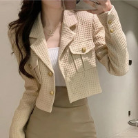 سترة نسائية بأكمام طويلة منقوشة ، بدلة بنمط كلاسيكي ، معطف بطية صدر ، تويد خشن ، قصير ، ربيعي