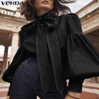 قمصان بوندا بربطة عنق بأكمام طويلة للنساء ، بلوزة مقاس كبير ، قمم ، تونك ، كاجوال ، أنيق ، أحادي اللون ، الموضة ، الخريف ،