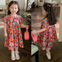 فستان بناتي مطبوع عليه زهور ، رقبة مستديرة ، سحاب خلفي ، قطن ، أكمام قصيرة منتفخة ، موضة حلوة ، فساتين كاجوال ، صيف ، 2-8 طن