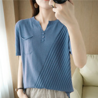 تي شيرت حريمي صيفي جديد 100% بلوفر قطن كم قصير فضفاض محبوك رقبة على شكل حرف v علوي غير رسمي موضة كورية لون سادة أكمام قصيرة
