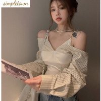 قميص مخطط طويل مكشوف الكتفين ، قميص قصير مناسب للجسم ، لوحة طبعة كورية ، جديد ، الربيع والصيف ، بأكمام