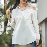Maden المرأة الفرنسية عادية غير النظامية قبالة الكتف حزام قميص الصيف تصميم الشعور عالية الجودة ضئيلة طويلة الأكمام قميص