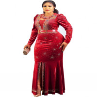 Maxi Dress Luxury Hot Diamonds Beaded Round Neck Long Sleeve Dress Gold Velvet Dress African Fashion Women 2022 New