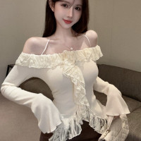 سترة نسائية مكشوفة الكتفين ، قميص بأكمام طويلة ، حافة دانتيل مكشكشة ، توب معطف لطيف على طراز الفتاة ، ملابس تريكة ، الربيع والخريف