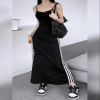فستان بروتيل أسود بحواف بيضاء للنساء ، تنحيف وتنورة طويلة مثيرة ، ألوان متباينة ، الصيف ،