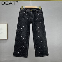 بنطال دينم أسود عالي الخصر للنساء ، بنطلون مستقيم ، ماس كامل ، منقوشة بحجر الراين ، ساق واسعة ، موضة جديدة ، 29L3145 ، الخريف ،