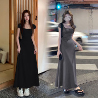 ملابس نسائية صيفية برقبة مربعة فرنسية فستان مربوط بطيات على شكل الورك فستان 2023 جديد فاخر للخصر منكمش على شكل حرف a تنورة طويلة