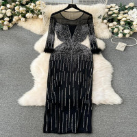 فستان نسائي شبكي بأكمام طويلة ، أسود ، نحيل ، رقبة مستديرة ، ماس ، عرض سجاد ، زي مسرحي ، أنيق ، حفلة مسائية ، فاخر ، خريف