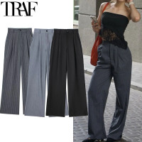 TRAF-سراويل رسمية نسائية ، بنطلون كاجوال بساق واسعة ، مخطط ، رمادي ، أسود ، خصر مرتفع ، بدلة فضفاضة ، ملابس مكتبية