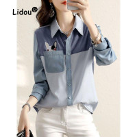 الموضة اللون مطابقة جيب واحدة الصدر بلوزة المرأة الجديدة الكلاسيكية طويلة الأكمام بولو طوق الأزرق الربيع الخريف قميص 2023