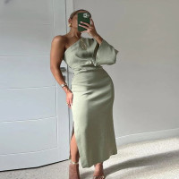 Mingmingxi فساتين خريفية مثيرة بكتف واحد وأكمام طويلة من مزيج الكتان أنيقة بدون ظهر شق فستان ضيق 2023 رداء مطوي