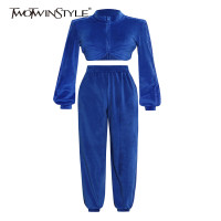 TWOTWINSTYLE Plush Two Piece Sets For Female Stand Collar Lantern Long Sleeve Cropped Top With High Waist Pant Women’s Suit New