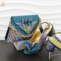 QSGFC-أحذية نسائية عالية الكعب مع تصميم زهرة حجر الراين ، مجموعة أحذية وحقائب الحفلات ، مضخات زرقاء اللون ، مزينة بكعب عالٍ ، أحدث