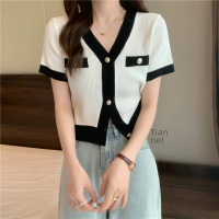 قصيرة محبوك تي شيرت للنساء ، عالية الخصر ، الخامس الرقبة ، رقيقة مفتوحة قميص ، حجم صغير ، ملابس الصيف