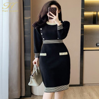 H Han Queen-Korean فستان بقلم رصاص ملون للنساء ، كم طويل ، محبوك بسيط ، حفلة مكتب غير رسمية ، الخريف والشتاء