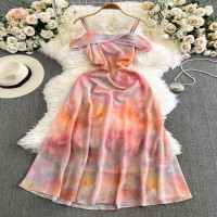 فستان شاطئ شيفون نسائي مكشوف الكتفين ، فساتين كلاسيكية للسيدات ، رداء مطبوع ضيق على شكل خط ، طويل ، فرنسي ، مثير ، أنيق ، صيفي