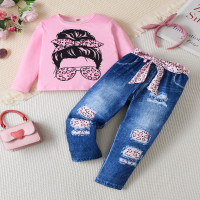 ملابس للفتيات بطبعة جلد النمر الوردي ، بلوفر وبنطال مريح ، خصر مرن وحزام ، مجموعة أزياء ، 2 *