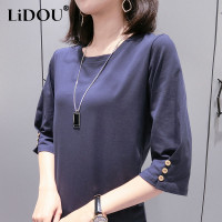الربيع الصيف س الرقبة بسيطة القطن فضفاضة بلوزة غير رسمية المرأة الصلبة 3/4 كم أزرار كل مباراة تي شيرت الإناث المحملة الملابس