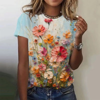 تيشيرت نسائي بطبعة زهور ملونة ثلاثية الأبعاد ، أكمام قصيرة ، موضة شارع كلاسيكية ، هاراجاكو ، صيفي ، كاجوال ، مقاس كبير