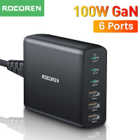 شاحن USB من Rocoren GaN بقدرة 100 واط ، 6 منافذ من النوع C PD شاحن سريع للشحن ، شاحن مكتبي USBC لهواتف آيفون وسامسونج وشاومي