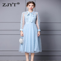 فستان ZJYT أنيق مزين بفيونكة ومزين بالدانتيل ومزين بشبكة ميدي للنساء للحفلات موديل 2023 فستان مثير بأكمام طويلة باللون الأزرق