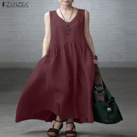 فستان طويل صيفي من ZANZEA بدون أكمام للنساء بتصميم عتيق وفتحة رقبة على شكل V فستان عطلات غير رسمي سادة فستان صيفي فضفاض من القطن للشاطئ Vestido Sarafans رداء