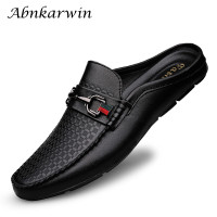 أحذية فاخرة ماركة مصمم الصيف جلد طبيعي عادية الانزلاق على نصف أحذية للرجال المتسكعون الشقق النعال ل ضيق رقيقة القدم