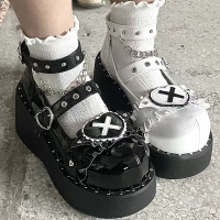 فاسق سلسلة معدنية منصة لوليتا أحذية النساء براءات الاختراع والجلود ماري جين أحذية امرأة النمط الياباني الكعوب المسطحة الكاحل الأشرطة الأحذية