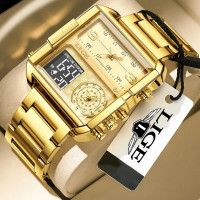 ساعة كوارتز مربعة من LIGE-Men بشاشة مزدوجة مقاومة للماء ، ذهبية ، علامة تجارية مشهورة ، فاخرة ، رياضية ، عسكرية ، عصرية ، جديدة ،