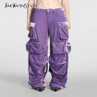 Twotwinstyle vintage السراويل النسائية ، عالية الخصر ، خليط ، جيوب ، فضفاضة ، عادية ، الاسلوب المناسب