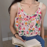 المرأة الأزهار طباعة بلا أكمام أعلى محصول ، موجة تنحنح أعلى دبابات ، في سن المراهقة ، الأزياء الكورية ، بوهو عطلة الزي ، الصيف