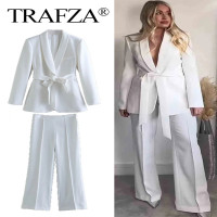مجموعة ترافزا النسائية الأنيقة المكونة من قطعتين طويلة الاكمام بحزام السترة معطف + بنطلون بسحاب مرتفع الخصر بنطلون بنطلون مكتب السيدات