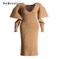 Twotwinstyle فستان الحد الأدنى للنساء كم طويل الخامس الرقبة عالية الخصر البلوز موضة ملابس الخريف