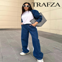 ترافزا-أزرار أكمام طويلة بلوفرات وجيوب خصر مرنة ، بنطلون بأرجل واسعة ، رقبة دائرية ، رمادي وأزرق كحلي ، أطقم سيدات ، خريف