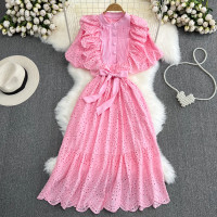 فستان أنيق مكشكش بفيونكة أنيقة على شكل حرف a أكمام منتفخة غير رسمية Vestidos برقبة دائرية ورقبة عالية لربيع وصيف الأجازات