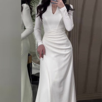 فستان نسائي أنيق بثنيات ، أحادي اللون ، مناسب للجسم ، رقبة على شكل حرف V ، بأكمام طويلة ، طراز لطيف ، الربيع ، الصيف ، جديد