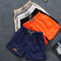شورت رجالي كاجوال بخصر مرن ، جيوب برباط ، ساق واسعة ، طباعة شعار ، أحادي اللون ، شاطئ ، صيف